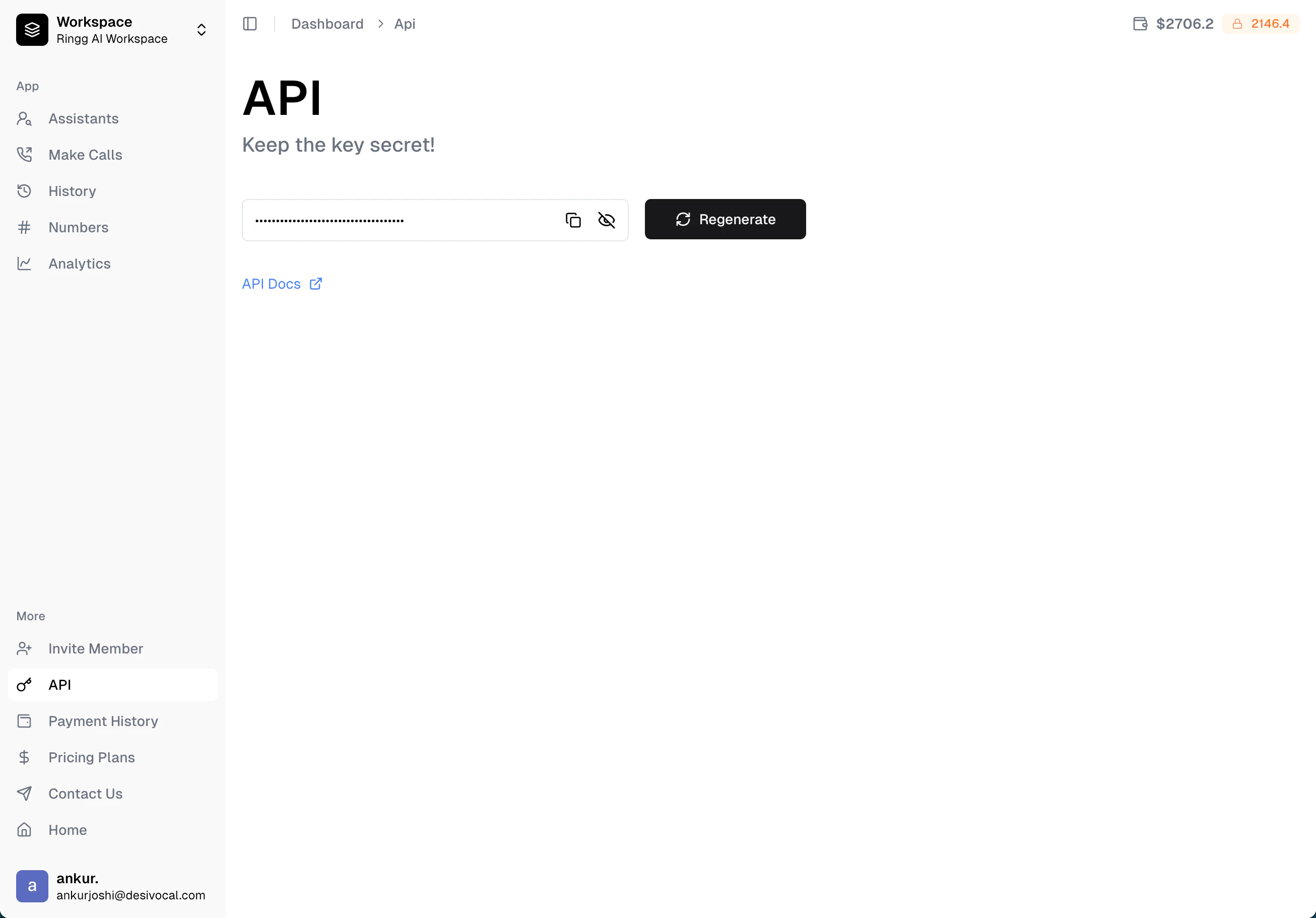 - Click the Regenerate button to create a new API key